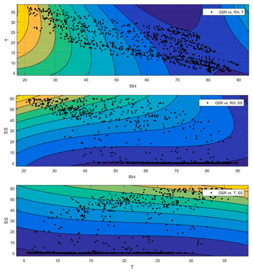 Moreover, Three-dimensional curve surfaces were plotted based on the predicted model equations to investigate the interactions among the variables (global solar radiation (GSR), sunshine (SS), relative humidity (RH), and temperature (T)). The effect of T, SS, and RH on the GSR is presented in Figure 10. Furthermore, the contour plots of the GSR indicate the interaction effects of the parameters. In each contour graph, the interaction effect of the three parameters was plotted. The contour areas help to explain how the GSR varies with changes in the weather conditions. These contour plots demonstrate that the interaction effects of all parameters were considerable.