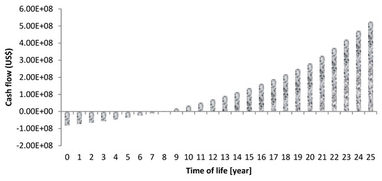 The financial parameters showing that the proposed system seems to be economically feasible are listed in Table 9. The overview of the cash flow over the project lifetime of solar plant projects for the selected region is shown in Figure 11. The cash flow indicates that the investor is expected to get positive cash flow from 7.8 years onwards from the solar plant project.