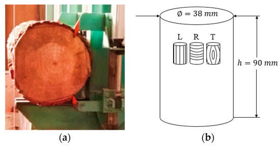 Obtaining samples: (a) cross section of the log. (b) Sample dimensions and anatomical directions. L: longitudinal, R: radial, T: tangential.