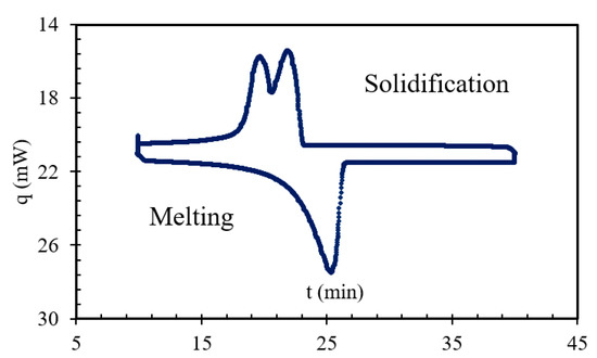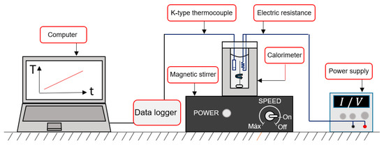 The setup for the determination of PCM heat capacity in the liquid phase consisted of a calorimeter containing the PCM (Figure 2), which was stirred with a magnetic stirrer (Hanna Instruments, model HI 190M), to keep PCM temperature homogeneous. Heat flux is generated by means of an electrical resistor, which was subjected to a controlled voltage power supply through a direct current generator (QW, model QW-MS305D). The temperature increase rate was obtained through a K-type thermocouple (Chromel–Aluminum joint) immersed in the calorimeter, and through a data acquisition system (National Instruments, model NI cDAQ-9174). PCM mass was obtained by means of an analytical balance (Radwag, model WLC 6/F1/R).