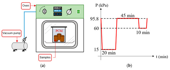 The impregnation method is based on the Bethell process [24]. In particular, the impregnation is carried out by immersing the wooden samples in a vessel containing the liquid octadecane, and then introducing it in a vacuum oven (Labtech, model LDO-080F) at 60 °C, to keep the pores of the wood dilated and PCM in a liquid state (Figure 3a). The impregnation process is carried out in three stages (Figure 3b), first an initial vacuum pressure of 85 kPa was applied for 20 min by means of a vacuum pump (Rocker 400) to extract the air from the porous matrix of the wood and increase the impregnation potential, second, the vacuum pressure was released, and the sample was kept at atmospheric pressure for 45 min during this time PCM impregnated the porous structure of the wood. Third, a vacuum stage of 40 kPa was applied for 10 min, to avoid the recoil effect and the percolation of impregnant through the surface of the wood. This stage was commonly used with water-based preservatives, when the wood samples were not immersed in the impregnant. Once the impregnation was finished, the wooden specimens were removed and dried with paper towels, to measure the retention of wood samples after impregnation with octadecane, maintaining wood samples temperature under the melting point. The calculation formula is: