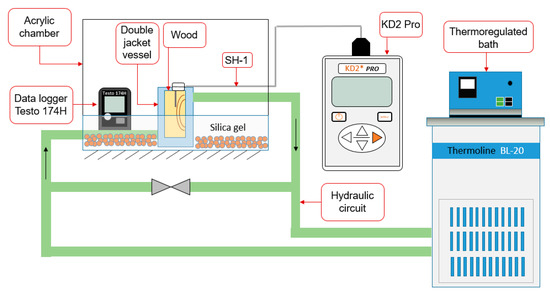 The properties of thermal conductivity and volumetric specific heat of the impregnated Pinus radiata wood were determined, considering PCM in solid state (5–20 °C) and in the liquid state (30–35 °C) within the impregnated wood. Thermal properties of the unimpregnated wood were considered constant in the analyzed temperature range and were measured at 25 °C. Samples in the three directions (longitudinal, radial and tangential) were considered. For each direction there were five samples, both impregnated and unimpregnated samples. The temperature control was made by means of water recirculation, using a thermoregulated bath (Ron-Fong Technology, model BL-20), inside a double-jacketed container where the cylindrical wooden sample were placed, filling the remaining spaces with thermal paste. To achieve a better controlled environment, the sample was placed in an acrylic vessel, to reduce the effect of external humidity, a plastic film was used to seal the vessel with a layer of silica gel. The temperature and humidity of the sealed vessel were measured with a Testo 174H data logger (Figure 4).