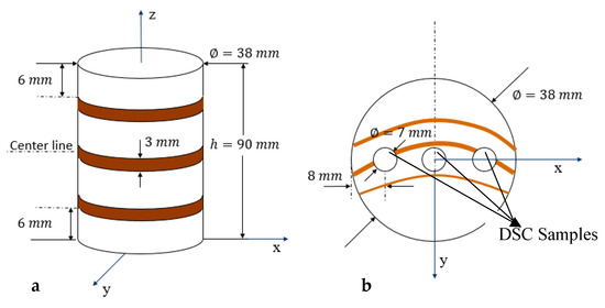 The phase change enthalpy of the impregnated wood and the impregnator was determined through a differential scanning calorimetry (DSC 4000 System, PerkinElmer). Disc-shaped cuts (3 mm thick) were made with a punching tool, from the impregnated wood specimens at three different equidistant positions (Figure 5a). Three samples were obtained from each of the three disc-shaped cuts: one in the center, and two at 8 mm from the ends, as indicated in Figure 5b. The samples were then sanded to an average thickness of 0.5 mm, to be weighed in an analytical balance with ±0.01 mg accuracy (Radwag, model AS 82/220.R2) and arranged in 40 μL aluminum crucibles for characterization, so that the diameter of the samples covered the base of the crucibles, as much as possible. The average mass of the samples for longitudinal, radial and tangential directions were 12.66 ± 1.18 mg, 14.63 ± 1.50 mg and 12.43 ± 1.54 mg, respectively, and PCM of 13.11 ± 2.27 mg.