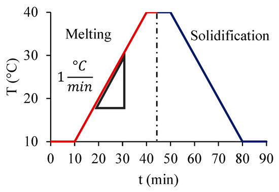 For DSC analysis (N2 atmosphere of 20 mL/min) of PCM and impregnated wood samples, a dynamic method was used, maintaining an initial temperature of 10 °C for 10 min, and then heating the samples at a rate of 1 °C/min until a temperature of 40 °C, that was maintained for 10 min. Then, the samples were cooled down to 10 °C at a rate of 1 °C/min, to finally keep the sample at 10 °C for 10 min, as shown in Figure 6. The relatively high heating and cooling rates obeyed to the restricted capabilities of the DSC. It is known that PCMs require a lower heating rate (0.1 °C/min) to obtain more accurate situation [25]. To diminish the effect of the mass sample, one increased the time of thermal equilibrium to 10 min in the DSC program. Moreover, it is important to mention here that the DSC technique was used to assess the distribution of PCM in the porous network of wood. Table 3 shows a summary of the experimental procedures with wood samples.
