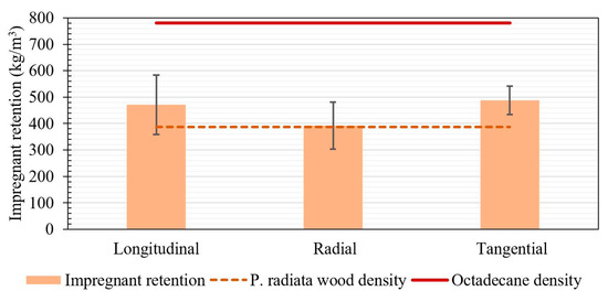 In general, the impregnation of Pinus radiata wood with octadecane did not change its dimensions, and despite the nonpolar character of the impregnant, the wood had a good retention capacity. The octadecane is distributed in a non-homogeneous way in the porous network of the wood, which anyway acquires the ability to store latent heat. Due to the impregnation, a reduction in the difference in thermal conductivity between the anatomical orientations was also found, maintaining the isotropic behavior of specific heat. In this way, the potential of the composite material in latent heat storage systems was demonstrated. However, tests on flammability, phenomenological study at a pore size scale and effects of wood type analysis (central, lateral, early or late, sapwood and heartwood) are required.