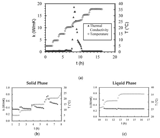 (a) Behavior of the thermal conductivity of impregnated wood sample (tangential cut) as a function of time and temperature: (b) solid phase details and (c) liquid phase details.