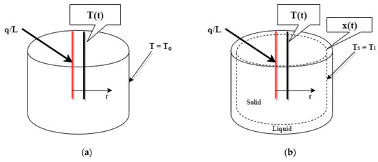 where the thermal properties are obtained from the constants ( and ). However in this case, there is a process of fusion of PCM incorporated within the wood porous matrix; so there is a mobile border between liquid and solid phases, whose position is time dependent (Figure 9b). For this reason, the boundary condition must be modified to r = ro at the solid–liquid interface x(t), where the solid (s) and liquid (l) phases are in thermal equilibrium (Ts = Tl. The position of the solid–liquid interface x(t) requires an additional equation that depends, in this case, from the latent heat of fusion [29]: