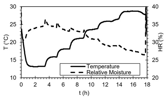 Temperature and humidity records in the test vessel are presented in Figure 10. One can see that during the vessel sealing with plastic film, both the temperature and humidity decreased rapidly, the former from the heat exchange with the double wall glass vessel that is at 5 °C, and the latter by moisture absorption by the silica gel. Furthermore, one can see that the temperature of the vessel was increasing due to thermal equilibrium stages, with the help of the thermoregulated device, achieving seven temperature levels. In the case of humidity, one can see, that after the initial abrupt decrease, it later increased due to the subsequent evaporation of the condensate that initially was formed on the surfaces of the hoses and the double-walled vessel, and then the relative humidity was dampened by moisture absorption by silica gel. Finally, the vessel was opened for sample change, and the relative humidity increased, becoming equal to that of the laboratory.