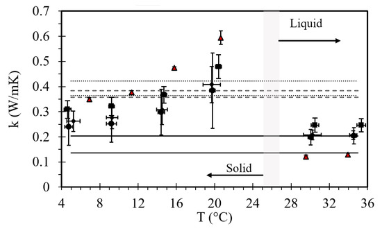 Pinus radiata wood impregnated with octadecane thermal conductivity (longitudinal: rhombus; tangential: square and radial: circle) of the unimpregnated wood (longitudinal: solid line; tangential: dashed line and radial: dotted line), and of octadecane (red triangle).