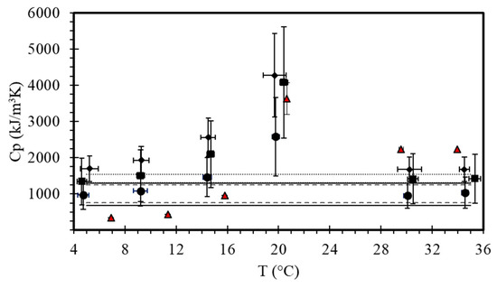 Volumetric specific heat of Pinus radiata wood impregnated with octadecane (longitudinal: rhombus; tangential: square and radial: circle), of the unimpregnated wood (longitudinal: solid line; tangential: dashed line and radial: dotted line) and octadecane (red triangle).