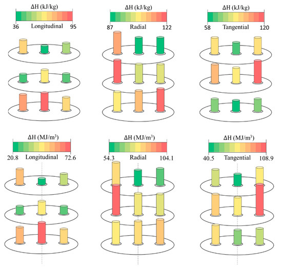 The ANOVA analysis indicates that there were no statistically significant differences (α = 0.05) of the average heat capacity values in between the three anatomical directions analyzed, when PCM was in the solid state. Similarly, when PCM was in the liquid phase (30–35 °C), the ANOVA analysis suggests that there were no statistically significant differences (α = 0.05) of the mean heat capacity values in between the three directions of the analyzed log.