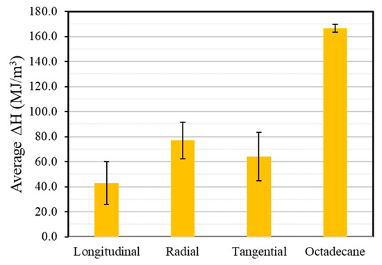 Figure 14 shows the distribution of the fusion enthalpy for the three anatomical directions analyzed, taking wood samples mass and the approximate volume as a basis. It can be observed that in each position there was a different enthalpy phase change magnitude that shows the heterogeneity of the impregnation. The samples analysis made by DSC on a sample for each direction shows that the radial direction presents a more homogeneous distribution of the capacity to store latent heat than the longitudinal and tangential directions. Figure 15 presents the results of the average phase change enthalpy for three anatomical directions of impregnated wood, and octadecane used as impregnant. The impregnated wood had phase change enthalpies from 23.8% to 49.9% from melting enthalpy of octadecane for longitudinal and radial directions, respectively. It is important to mention that the volume of the samples was obtained by using the weights and the approximate volume of each sample, assuming that they were discs of uniform shape.