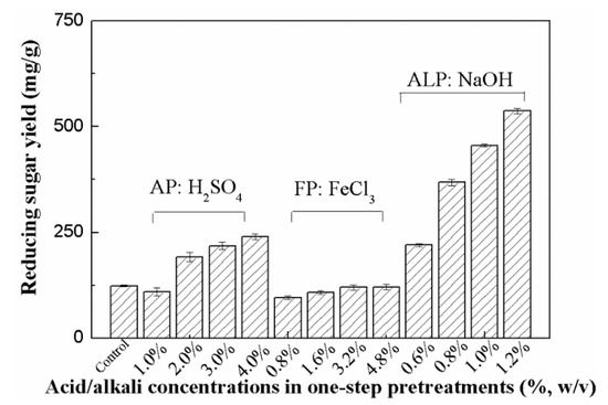 Cellulosic components, mainly hemicellulose dissolved in AP and FP, will be further converted into soluble sugars [15,20]. In the case of ALP, the soluble sugar recovery from the pretreatment liquid was not very significant despite its obvious weight loss in the pretreatment stage. Soluble sugar levels gradually increased from 52.5 mg/g raw stalk (RS) to 90.8 mg/g RS. As compared to ALP, a relatively higher soluble sugar recovery was observed in the case of AP (Table 1). As the H2SO4 concentrations increased from 1.0% to 4.0%, the levels of soluble sugars in the aqueous phase of the pretreated mixtures reached 114.3 mg/g RS (Table 1).