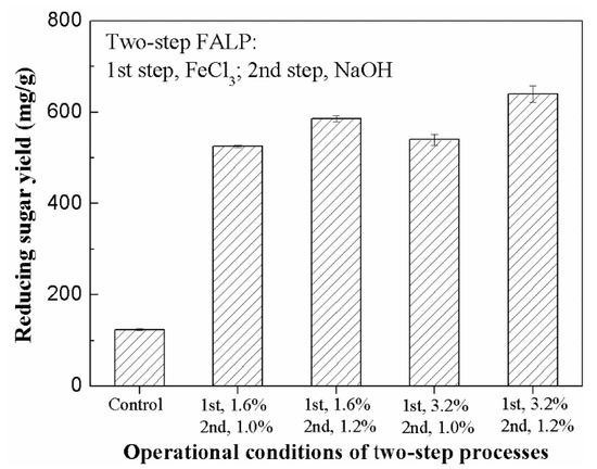 The samples were firstly treated using 1.6% or 3.2% FeCl3 at 120 °C for 30 min. The FP samples treated under these conditions were collected for the second ALP with 1.0% or 1.2% NaOH, respectively. The obtained FALP sample was used for the subsequent enzymatic hydrolysis. As shown in Figure 3, the reducing sugar level in the enzymatic hydrolysis of the FALP sample from relatively mild conditions (step 1, 1.6% FeCl3; step 2, 1.0% NaOH) reached as high as 525.3 mg/g PS, an increase of 338% compared to that obtained in the one-step FP process. In the enzymatic hydrolysis of the FALP sample from relatively severe pretreatment conditions (step 1, 3.2% FeCl3; step 2, 1.2% NaOH), the sugar yield reached the highest level of 639.7 mg/g PS, which was much higher than those obtained from both raw stalk and all of the AP, FP, and ALP samples.