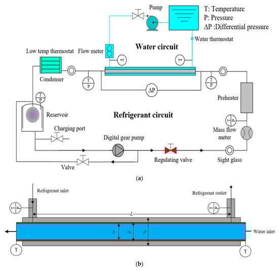 The refrigerant loop consisted of the following components: a tube-in-tube heat exchanger (test section), condenser, reservoir, digital gear pump, flow regulator, Coriolis mass flow meter, electric preheater, sight glasses, and valves. The test section was manufactured as a straight, horizontal counter-flow tube heat exchanger (length of 2 m). Platinum RTDs (resistance temperature detectors) were installed at the inlet and outlet of both the water side and the refrigerant side; they were able to measure the temperature with a calibrated uncertainty of ±0.1 K. Refrigerant saturation pressure was determined by a pressure transducer (Rosemount 3051) with a range of 0–5 MPa, installed at the entrance of the test section; additionally, a differential pressure transducer was employed to measure the overall pressure drop for refrigerant flows. After leaving the test section, the refrigerant flowed into a low-temperature alcohol thermostat bath; then, the two-phase refrigerant was condensed, sub-cooled, and recirculated back into the reservoir. The sub-cooled refrigerant liquid in the reservoir was then pumped into the preheater by a gear pump; the mass flux meter (between the gear pump and the electric preheater) was utilized to ensure that the actual mass flux of the refrigerant loop was within an uncertainty of ±0.2% of the reading. The sub-cooled refrigerant was heated (in the preheater) by an electric heater; the electric heater was powered by a low-voltage and high-current direct current (DC) regulated power supply. The electric current varied in the range of 0–100 A with a fixed voltage of 50 V, and a maximum power of 5 kW could be supplied to heat the refrigerant in the preheater. Both the voltage and the current were collected to calculate the heating power. Therefore, the outlet vapor quality at the preheater could be controlled by the current. The enthalpy of the inlet refrigerant for the preheater was determined from the temperature and pressure, which were measured using the Platinum 100 RTD and the pressure transducer. Inlet vapor quality was calculated from the heat balance of the preheater; the electric preheater was well insulated (electrically and thermally) with a heat loss fraction lower than 5%, in order to ensure the accuracy of measurements. The water loop contained the tube side of the test section, a centrifugal pump, a thermostat bath, a magnetic flow meter, and a regulator valve. The heat input of the test section varied with the temperature of the thermostat bath and the water flow rates; in order to achieve the desired vapor quality, the refrigerant was heated or cooled in the test section. Additional details of the test apparatus can be obtained from Li et al. [].