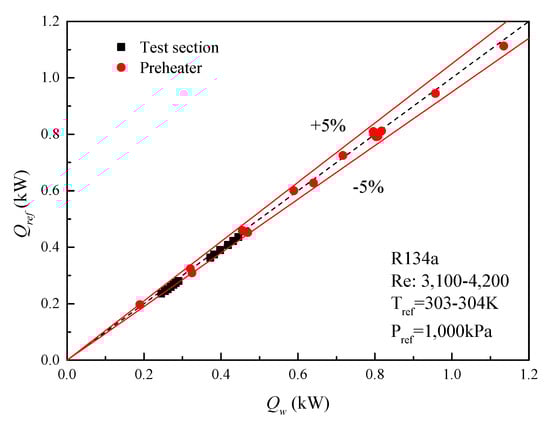 Figure 2b illustrates the test section employed in this work; the test section was a double-pipe heat exchanger with an effective heat length of 2 m. In this study, tubes with an inner diameter of 25 mm and 26 mm were employed as the outer tube in order to investigate the effect of annulus width; the tested tubes were used as the inner tube of the heat exchanger. In addition, the whole test section was well insulated, covered by a 40-mm-thick layer of polyurethane (thermal insulation), ensuring the accuracy of the experimental results. Before the evaporation and condensation experiments, the thermal insulation of the test section was verified using single-phase flow tests; the heat balance of the water side and refrigerant side in the test section and the preheater is given in Figure 3. The deviation in the heat balance between the water side and refrigerant side fell in an error band of ±5%; from this analysis, it is reasonable to conclude that the test section and the preheater were well insulated.
