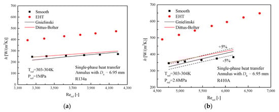 Variation of the single-phase heat transfer coefficient as a function of Reynolds number, and comparison against Gneilinski [] and Dittus–Bolter correlation using work fluids: (a) R134a; (b) R410A.