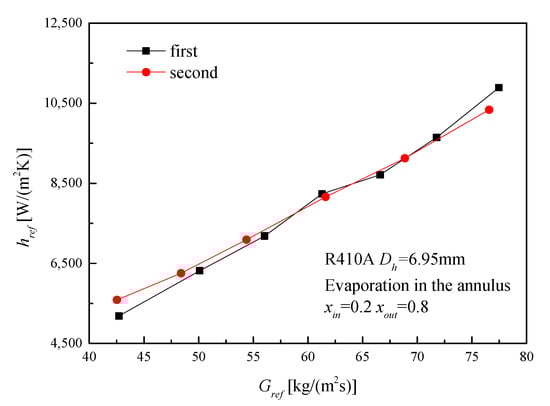 Single-phase heat transfer experiments were conducted for the validation of test procedures. Figure 4 depicts the relationship between the heat transfer coefficient and the Reynolds number. The single-phase experiment was conducted using R134a and R410A in the turbulent regime to validate the present test procedure. The average temperature along the test section was kept in the range of 303–304 K, and the ambient temperature was controlled at 298 K by an air-conditioner. The results were compared against the Gneilinski [] correlation and the Dittus–Bolter correlation. All the data points could be predicted within ±10% by the Gneilinski [] correlation. The EHT tube could produce a single-phase heat transfer enhancement ratio of 1.45–1.76 for the present test conditions compared to the smooth tube. In addition, a series of repetitive experiments were conducted using R410A to validate the present test procedure, and the tube-in-tube heat exchanger with Dh = 6.95 mm was employed. The same tube-in-tube heat exchanger made of the smooth tube was used for the further experiments of R134a. Two experiments were carried out on two different days for the flow boiling heat transfer performance in the annulus of the smooth tube. The inlet and the outlet vapor quality were fixed at 0.2 and 0.8, respectively. Figure 5 demonstrates a comparison of the two results, and good agreement was found between them. Therefore, it is reasonable to conclude that the results in this study have good repeatability.