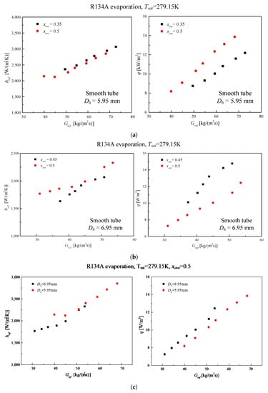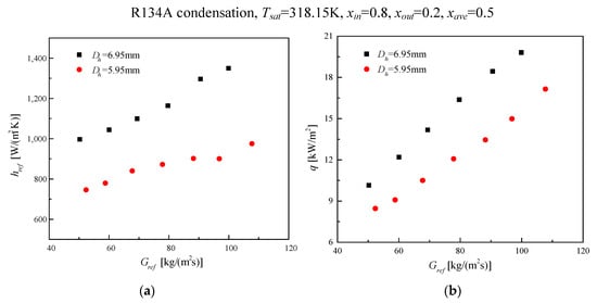 In the condensation study, two test sections with different inner diameters of the outer tube were employed to investigate the influence of the annulus gap. The relationship of the condensation heat transfer and mass velocity is given in Figure 6a; the corresponding heat flux values are also given in Figure 6b for a comparison. These results differ from similar experimental investigations reported by Tang and Li [] and Chen et al. []; the results of the present study show that the heat transfer coefficient increased with increasing mass flux, implying that the convective condensation component occupied an important role in the overall heat transfer for the present test conditions. Additionally, increased mass fluxes could also improve the interfacial shear stress and move the accumulated condensate at the bottom of the annulus to the upper part, improving the overall performance.