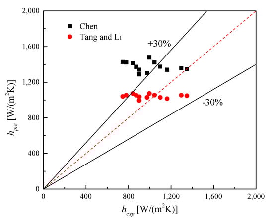 It should be noted that the average vapor quality along the test section was employed for the prediction of heat transfer coefficients for simplification. In addition, little difference was found between the predicted values calculated from average vapor quality and the average value in the vapor quality range. The comparison between the experimental and predicted values of Chen [] and Tang and Li [] correlation is illustrated in Figure 7. There was an obvious deviation between hexp and hpre for the Chen correlation; all these data points were overpredicted with a mean absolute deviation (MAD) of 42.5%. When using the Tang and Li [] correlation, an acceptable prediction was given with a MAD of 7.9%; 84.6% of the data points could be predicted in an error band of ±30%. However, neither of the above correlations could accurately predict the variation of the heat transfer coefficient versus mass flux, which would be an important contribution to the thermal performance during condensation in the annulus. Additional investigations and experimental data are demanded to explore the heat transfer mechanisms during this phenomenon.