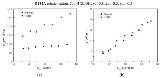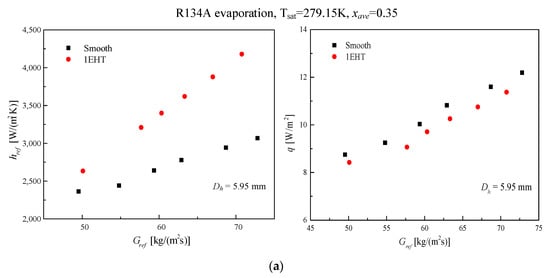 The effect of mass velocities on the heat transfer performance was investigated with fixed average vapor qualities of 0.35 and 0.5; results are given in Figure 12. Figure 12a shows the heat transfer coefficient during flow boiling in the annulus of the 1EHT tube for xave = 0.35 (see Figure 12a); the heat transfer coefficient was enhanced by 11–36% when compared to the smooth tube. The heat transfer coefficient of the 1EHT tube increased with increasing mass velocities and heat flux. For xave = 0.5 (see Figure 12b), the performance of the 1EHT tube was not as good as the smooth tube at the tested mass velocities. The strange heat transfer performance of the 1EHT tube can be attributed to the enhanced external surface structure which consisted of depression and micro-pit arrays. The depression increases flow turbulence and enhances fluid mixing for single-phase flow; it would be reasonable to conclude that the droplet entrainment and interfacial phase mixing can be greatly enhanced by the depression. At a relatively high vapor quality, the liquid phase on the upper part of the annulus would accumulate in the large cavities; this would result in decreased film thickness for other parts of the surface without cavities. As mentioned previously, the stratified flow in the annulus may be less than the heat transfer performance of the upper part, with an accumulation of liquid phase in the large cavities. This may decrease the effective flow boiling heat transfer area for flow boiling, since nucleate flow boiling occurs only on the interface between the wall and liquid phase. A similar in-tube experimental investigation was conducted by Chen et al. [], with their results indicating that the heat transfer coefficient decreased with increasing vapor qualities, especially when the vapor quality exceeded the transitional vapor quality between stratified-wavy flow and slug/stratified flow; the transitional vapor quality for the enhanced tubes was higher than that for the smooth tube. Similarly, the flow patterns in this study may change from slug/stratified flow to stratified-wavy flow for xave = 0.35 and xave = 0.5; the heat transfer performance can be seen to deteriorate. More experimental investigations are demanded to explore the complex interaction between enhanced structures, liquid distribution, and the flow pattern transition during flow boiling in the annulus.