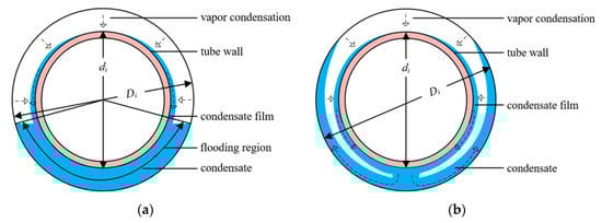 Figure 8a shows the variation of the heat transfer coefficient with mass flux during condensation on the outside of the 1EHT tube in the annulus; results were compared to the smooth tube. Figure 8b provides the heat flux variation for all of the test conditions. As can be seen, there was little variation between the 1EHT tube and the smooth tube; therefore, it is reasonable to compare their thermal performance under the same mass flux. It should be noted that all the results in Figure 8 were acquired for condensation in an annulus with an outer diameter Di = 25 mm, with the heat flux ranging from 8–18 kW/m2. The results demonstrate that the 1EHT tube provided an enhancement to the annulus condensation heat transfer performance (when compared to a smooth tube) in the range of 98–178%. According to Chen et al. [], the superior performance of the 1EHT tube for condensation in an annulus was explained by the turbulence and flow pattern change caused by the enhanced surface structure. Additionally, surface tension might be a dominant contributor to the condensation heat transfer for Gref < 50 kg/(m2∙s). Tang and Li [] concluded that increasing the mass flux in the annulus may change the flow pattern; two possible flow patterns are given in Figure 9. Generally, the cross-sectional liquid distribution depends on the joint actions of three forces, including gravity, surface tension, and shear stress. At low mass fluxes, the condensate would accumulate at the bottom due to gravity being dominant; as the mass flux increases, shear stress begins to have a greater influence. In addition, the specific structures of the external tube surface can augment the convective heat transfer and begin to produce more turbulence, fluid mixing enhancement, boundary layer disruption, and creation of secondary flows.