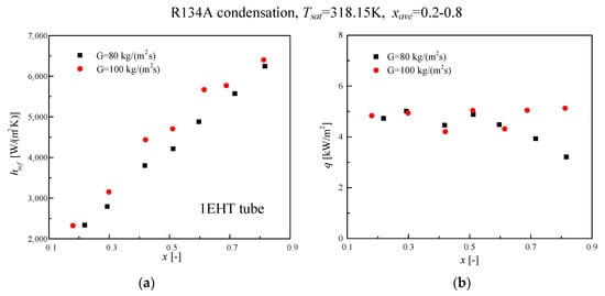 The effect of vapor quality on the condensation characteristics in the annulus was also investigated at fixed mass velocities Gref = 80 kg/(m2∙s) and Gref = 100 kg/(m2∙s); results are given in Figure 10a. The results indicate that the heat transfer coefficient increased rapidly with increasing vapor quality, especially for the vapor quality xave < 0.6, and the thermal performance of the 1EHT tube at Gref = 80 kg/(m2∙s) was slightly worse than that at Gref = 100 kg/(m2∙s). The steep slope for the heat transfer coefficient versus vapor quality resulted from the increasing cross-sectional void fraction; the condensate redistributed circumferentially and produced a decrease in the average film thickness on the tube. Figure 10b shows that the heat flux was fixed in a narrow range of 3–5 kW/m2. Heat transfer coefficients at xave = 0.5 were nearly two times higher than those data points in Figure 8a at the same mass flux. This could have been caused by the increased film thermal resistance on the external surface of 1EHT tube with the increased heat flux. The negative relationship between heat transfer coefficient and heat flux seems to have a steeper slope than predicted in the Chen et al. [] and Tang and Li [] correlation. The steeper slope may be attributed to the increasing condensate on the tube, and the severely flooded dimples on the surface with increasing heat flux. Generally, gravity causes the condensate on the surface to flow down the tube and accumulate at the bottom of the annulus; however, increased heat flux and dimples may increase the film thickness and degrade the thermal performance.