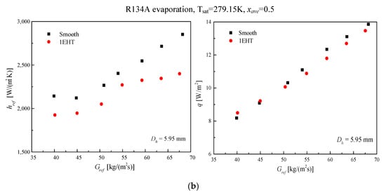 Variation of (a) heat transfer coefficient and (b) heat flux as a function of mass flux during condensation on the 1EHT tube in the annulus with Dh = 5.95 mm compared to a smooth tube.