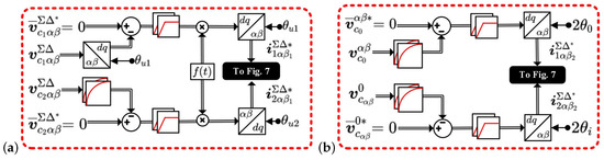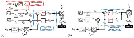 On the other hand, the output port current control diagram is presented in Figure 5b. Similarly, the current references are calculated from the reactive and active power set-points and implemented in a synchronous frame rotating at . It is important to highlight that the control diagram of Figure 5b is modified as explained in Section 4 to enable the UPFC capabilities.