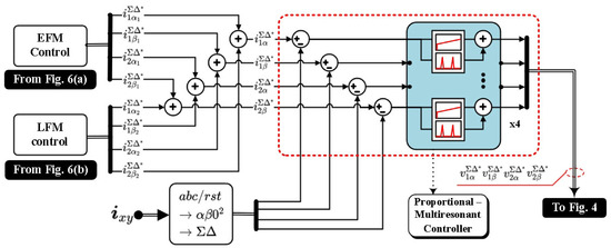 The proposed circulating current control system is shown in Figure 7. The circulating currents are referred to the double- frame to be regulated by the proposed controller. Each circulating current is controlled using Proportional Multi-Resonant (PMR) controllers, which are tuned to regulate the circulating current harmonics produced by the CCV control systems. This is certainly an improvement over the conventional control approach where proportional controllers are used [15,16,17,18,23,26].