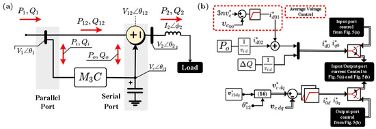 The based UPFC topology is shown in Figure 8a. The input port of the is connected to bus 1 to provide shunt FACT capabilities, whereas, the output port is connected to bus 2, and it is controlled as a series FACTS. The control strategy used to enable UPFC capabilities in both ports is presented in Figure 8b, and it is based on [30,31,32,33,34]: