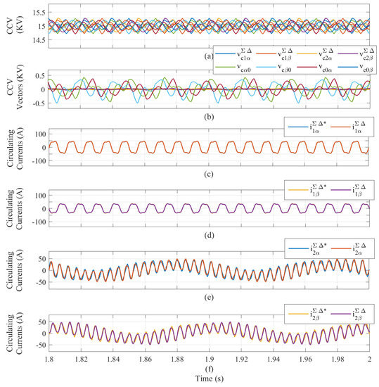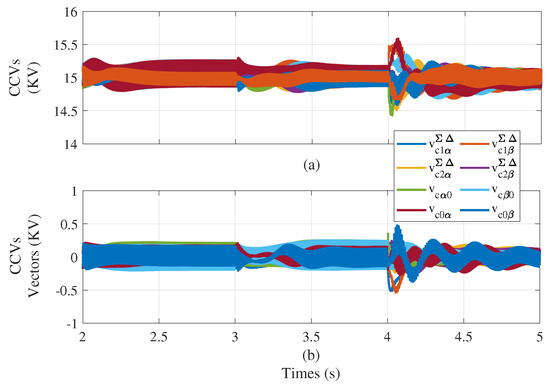 The CCVs were successfully regulated to their nominal value of 15 kV as shown in Figure 10a and Figure 11a. Additionally, the regulation of CCV vectors (, ,, and ) was similar using both strategies, as shown in Figure 10b and Figure 11b.