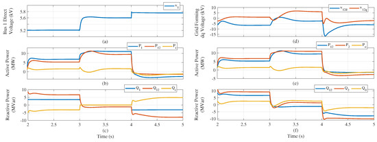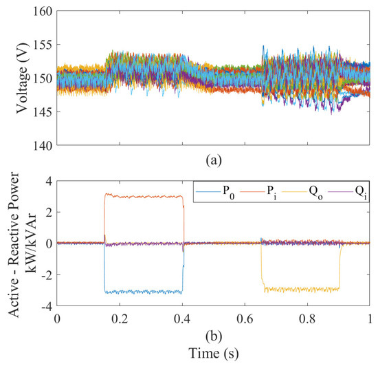 In this case, the input port uses a similar control strategy as the direct power control shown previously in Figure 5a, operating in grid-following mode and oriented along with the voltage of bus 1. In order to represent voltage variations in bus 1, droop control is implemented at the input port. The voltage variations are imposed by the reactive power , which corresponds to the reactive power required at bus 1.