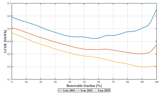 Renewable fraction vs. real levelized cost of energy for 2015, 2025, and 2035 [13].