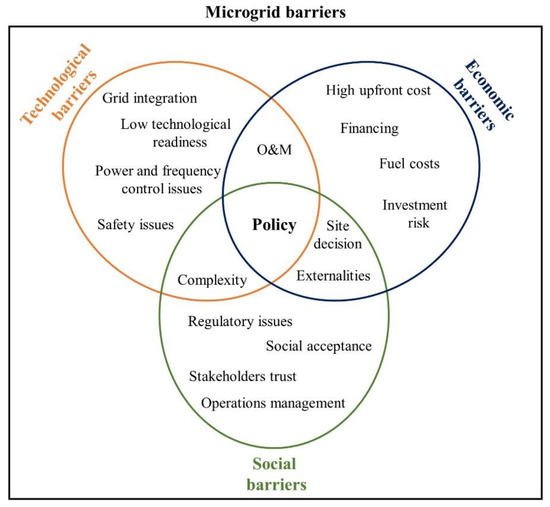 Despite the increasing number of microgrid projects for off-grid electrification, there are a limited number of studies that have assessed the effects of policy measures on the design of microgrid systems. Most of the literature available has primarily focused on specific case studies that demonstrate the technical feasibility of a project or on demonstrating the advantages of the proposed optimization method. Often, because of numerous simplifications, microgrid studies have concentrated on finding new solutions to technological and operational challenges and have ignored the impact of different political and social barriers as well as their policy implications. A simplified diagram that depicts the microgrid barriers to entry and their relationship is presented in Figure 2.