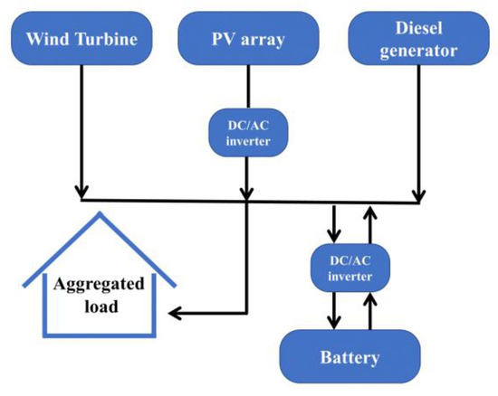 In this study, we employed a computable model to evaluate the potential effects of policy interventions, namely capital subsidies and fossil fuel subsidies on the optimal configuration of microgrids with hybrid power sources. Furthermore, to show the role that subsidies play on the economic viability, design, and disposition of these types of systems, an illustrative example is provided. The hybrid-microgrid example, which is based on several simplifying assumptions and values obtained from the literature, is intended to represent a generic case study from which policymakers and other stakeholders can widen their understanding of microgrid design. In our analysis, for simplicity, we excluded the representation of demand-side management (DSM) strategies and technologies (e.g., community involvement, limiting business hours, efficient appliances and lights, load limiters, smart controllers, prepaid meters, among others) since these practices frequently require detailed information on the local cultural context of the unelectrified community (including, household income, customer expectation, an microgrid business model). Moreover, the example demonstrates the impact that subsidy mechanisms—mainly designed to promote renewable energy technologies—have on the LCOE of these systems. The microgrid combines solar and wind generating units, a battery storage system, and a backup diesel generator. The schematic layout of the islanded system is shown in Figure 3.
