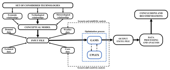 The model estimates the required capacity of each component in the microgrid as well as their operating schedule at each hour of the time horizon. In the case of the battery storage, the model includes in the objective function a one-time replacement option which can occur within the project lifetime. The replacement cost of the subsystem is equivalent to the capital costs converted into a stream of equal annual payments with the use of the capital recovery factor. The optimization tool was implemented in GAMS (General Algebraic Modelling System) on an Intel i7-8650U (1.9 GHz personal computer with 8.0 GB of RAM, running a 64-bits Windows 10) and solved using CPLEX 12.9. The optimization framework described in this section was then applied to analyze the assumptions and data of the illustrative example. After running a series of sensitivity cases with different capital costs, fuel prices, interest rates, and meteorological parameters, the results were exported to Excel and then post-processed with MATLAB 2019b. The flowchart of the optimization framework is presented in Figure 4.