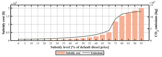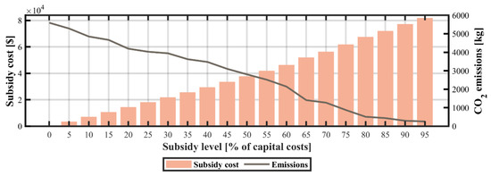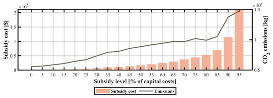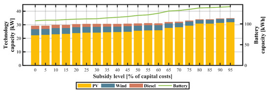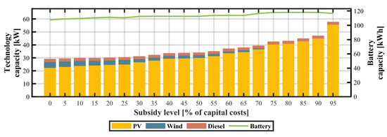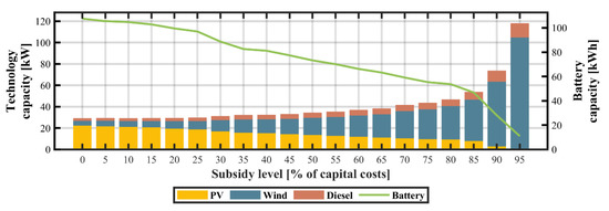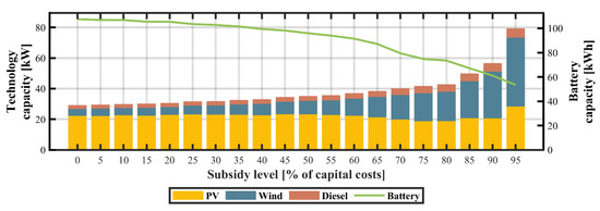 The dramatic drop in PV module prices has led to the growing popularity of mini- and microgrid systems. Unfortunately, in several developing economies the high upfront costs and long payback periods of distributed PV pose a major barrier to their widespread deployment. Therefore, a common strategy employed by governments to reduce the capital costs of such technologies has been to provide financial incentives and subsidy schemes [65]. The results of the sensitivity analysis of capital subsidies for PV technologies are shown in Figure 11, Figure 12 and Figure 13. The progressive increase in capital subsidies for PV technologies causes the model to displace wind and diesel subsystems, leading to a decrease in CO2 emission levels. At a 60% reduction in capital costs, the installed capacity of PV, and wind subsystems account for approximately 90.1% and 4.1%, correspondingly. The LCOE is approximately $0.21/kWh and the TLCC of the system is $93,805. The system configuration comprises a 2.17 kW diesel generator, a 33.5 kW photovoltaic subsystem, a 1.51 kW wind turbine, and a 114 kWh battery. Above the subsidy level of 70%, the microgrid is solely powered by PV in conjunction with batteries and a diesel backup generator.