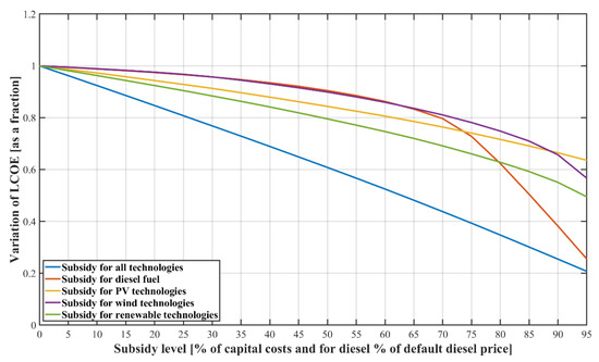 The unprecedented uncertainty on the global gas and oil markets as well as the volatility of fuel prices have a significant effect on the economics of microgrid systems. Moreover, fossil fuel subsidies provided by numerous governments have kept renewables at an economic disadvantage. According to the International Monetary Fund (IMF), emerging economies in Asia, Middle East, Latin America, and Sub-Sahara Africa continue to subsidize fossil fuels and account for almost 56% of the global energy subsidies [67]. These types of subsidies have intensified the barriers to the deployment of RES. Consequently, it is imperative to assess the impact of such subsidies on the final microgrid configuration, TLCC, LCOE, and CO2 emissions. The results obtained from the sensitivity analysis of diesel fuel subsidies are depicted in Figure 17, Figure 18 and Figure 19. From the figures, it can be found that as the diesel price gradually decreases, the installed capacity of PV, wind, and battery technologies also decrease. With a higher subsidy level, RES become economically unviable and the entire system is mainly powered by a 16.5 kW diesel generator. Low diesel prices reduce the importance of renewable technologies and promote the utilization of diesel fuel for electricity generation. Further, out of all the subsidies analyzed in this study, fuel subsidies lead to the highest levels of carbon dioxide emissions and the lowest values of subsidy costs. Subsidies higher than 70% result in a sharp increase in the capacity of the diesel generator and in the second-lowest LCOE ($0.07/kWh) observed among all analyzed cases. This also demonstrates that low capital costs of internal combustion engines combined with diesel fuel subsidies have a negative impact on the deployment of sustainable energy systems and on the reduction of greenhouse emissions.