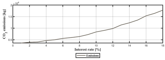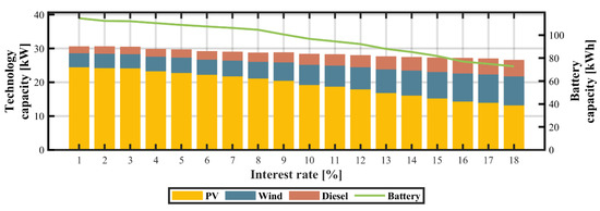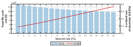 Figure 21, Figure 22 and Figure 23 illustrate the effects of various interest rates on the optimal configuration of microgrids as well as their impact on the TLCC, LCOE, and total CO2 emissions. The range of the parameter associated with the interest rate was selected based on the analysis of lending rates in 107 developing economies. On the one hand, it can be observed that low interest rates favor capital-intensive technologies that have small O&M costs (mainly PV and battery subsystems). On the other hand, high interest rates yield adverse environmental effects, increasing the total carbon dioxide emissions of the system. With higher interest rates, there is an increase on the utilization of diesel fuel and wind power for electricity generation, and a continuous drop in PV and battery capacities. As the objective function of the optimization model is defined in terms of TLCC and not LCOE, increasing interest rates lead to greater fuel consumption and higher LCOE values, exceeding $0.45/kWh with an 18% interest rate.