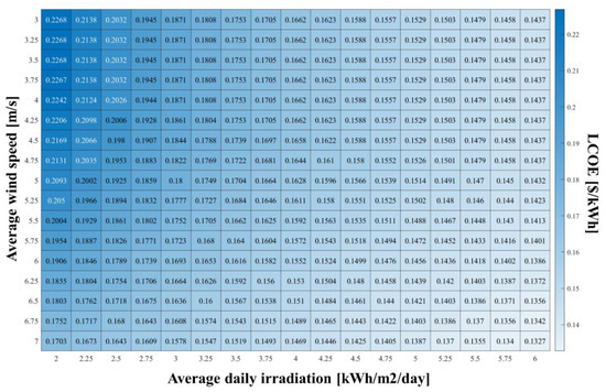 Solar and wind power generation are highly dependent on the local meteorological conditions. As a result, the sizing of these two components in a microgrid system is strongly related to the observed values of wind speed and solar irradiation. Currently, only a limited number of countries have proposed the use of financial incentives for batteries in small residential applications; therefore, it is of interest to understand the effects a hypothetical financial scheme for off-grid systems. Table 3 presents the results from the sensitivity analysis carried out to assess the impact of solar irradiation and wind speed on the LCOE of a system benefitting from a 50% capital subsidy scheme (targeted towards PV and EES technologies). The sensitivity analysis showed that the system configuration with the lowest TLCC ($58,978) occurs at a wind speed of 7 m/s and solar irradiation of 6 kWh/m2/day. The majority of the electricity load is served by the PV (20.52 kW) and energy storage subsystems (107.42 kWh) and backed up by a diesel generator (2.51 kW). At a wind speed of 3–4 m/s, the wind subsystem is fully excluded from the optimal configuration. Additionally, the analysis demonstrated that poor weather conditions (3 m/s and 2 kWh/m2/day) have a significant impact on the TLCC and consequently lead to a higher LCOE ($0.51/kWh). This is due to the large EES (140.68 kWh) and PV capacities (73.91 kW). Figure 24 shows the impact of the variation of meteorological parameters on the levelized cost of electricity.