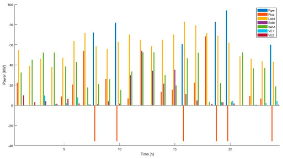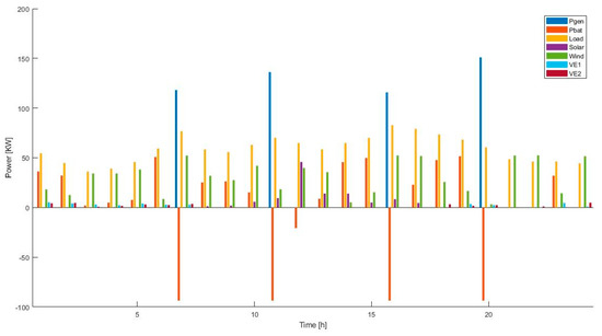 The DEEPSO (Section 3.2) optimization algorithm was tuned and applied to the problem formulation (Table 2, Table 3, Table 4, Table 5, Table 6 and Table 7). The population size in each generation of the algorithm was 20, and the algorithm had a stop criterion according to the improvement of the target function (the algorithm stop after 10 iteration of less of 0.5% of improvement in the target function). Bearing in mind that the system started operation up until now, after the implementation of all the equations and parameters associated with the costs of the MG under study, the position where the operation cost is minimum is identified (Figure 1).