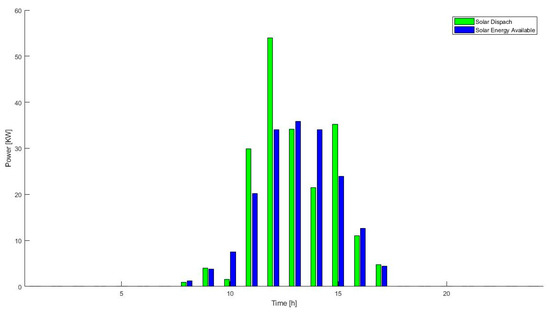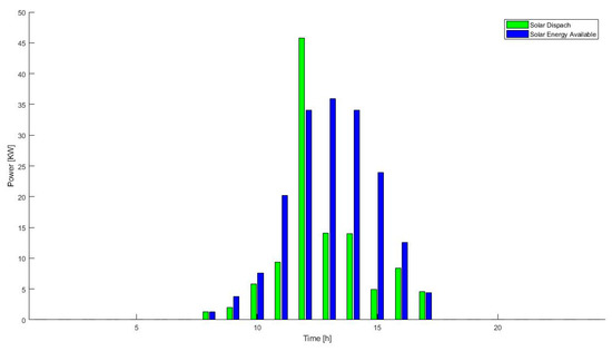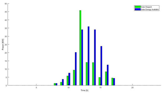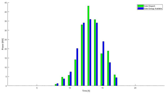When the energy storage system is new, according to Figure 1, during every hour the solar energy is available, not all the energy available is directly dispatched. The rest of the energy is stored in the batteries of the system, and it is used in the hours when there is going to be a higher impact in the reduction of operation costs of the system, as the 24 h operation shows (Figure 6).