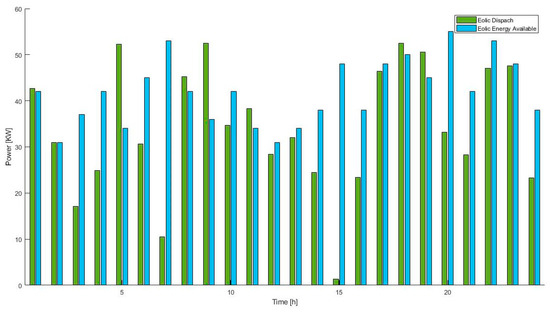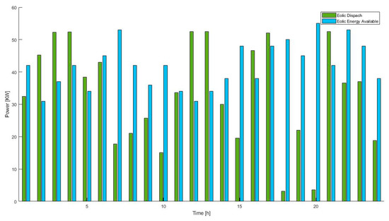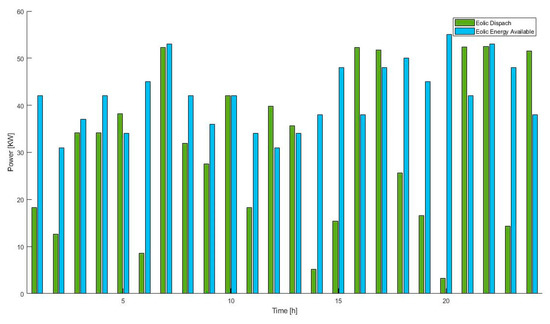 When the system is at 60% of its useful life (Figure 11), the dispatch of wind energy is lower than the one available, since the algorithm used to program the system strongly such that it penalizes the overestimation of wind energy dispatch and in this way the algorithm underestimates the available power, minimizing the costs due to the possibility of not having the resource, in this case, the wind speed.