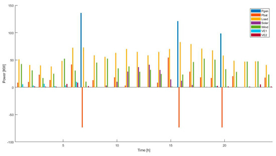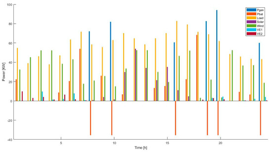 In recent efforts, different algorithms have been used to find the optimal operating point in a MG. For example, in the reference [1], the hybrid differential evolution and harmony search (hybrid DE-HS) algorithm was used, while in reference [2], the objective function intends to minimize the operation cost of the MG considering the AC and DC grids. Other studies [3,4] have considered the time slots in which the energy costs are higher or lower depending on the user’s consumption. On the other hand, some researchers have considered electric vehicles in the MG, including the Vehicle2Grid option (V2G), a technology with the capability of being charged using the energy supplied from the grid and sometimes returning the stored energy to the grid. Nevertheless, this feature has a series of power and energy restrictions. These ones have been handled by using the most effective strategy to reduce the peak load and increase the power consumed in the valley of the demand curve of the customers. In order to get a solution, the methodology (in references [5] and [6]) focused on different energy prices at different time slots.