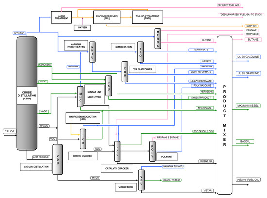 Overview of the main material flows through the refinery processes. Adapted with permission from [41]; Copyright 2013, J.F. Brau.