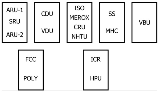 Basic refinery layout showing the 16 process units and the seven distinct process areas. ARU: amine recovery; SRU: sulphur recovery (including the TGTU: Tall Gas Treatment Unit); CDU: crude distillation; VDU: vacuum distillation; ISO: isomerization; MEROX: mercaptan oxidation; CRU: catalytic cracking reforming; NHTU: naphtha hydrotreating; SS: Synsat; MHC: mild hydro cracker; VBU: Visbreaker; FCC: fluid catalytic cracker; POLY: polymerisation; ICR: hydrocracking; HPU: hydrogen production.