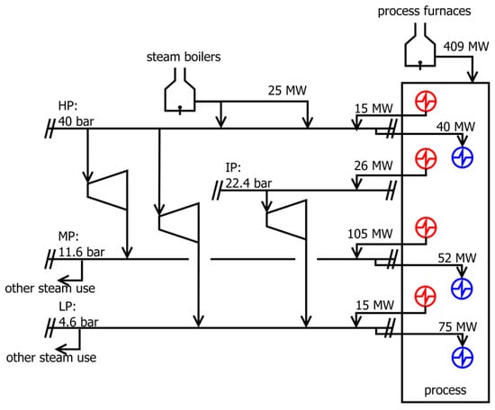 A steam network is used to collect and distribute heat between different units and areas [30]. Additional steam may be provided by steam boilers. Steam turbines for power production are also available. A simplified scheme of the steam system is shown in Figure 3.