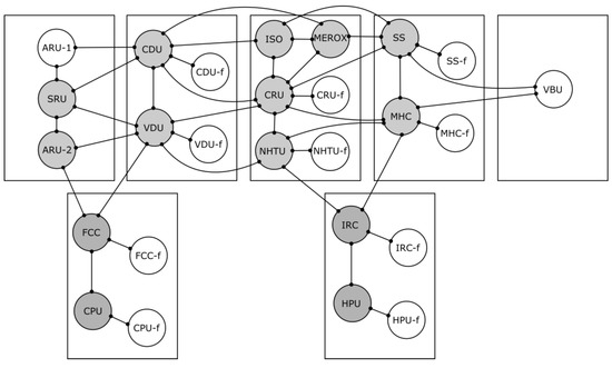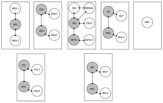 For the cases c) and d) in which unit-to-unit integration is allowed, it was decided that the streams above 250 °C are only allowed to exchange heat with other streams within the same unit, to take into account possible practical limitations of long piping distances for high temperature streams. This heat exchange limitation was imposed by grouping the portions of such streams above 250 °C into new virtual units denoted in Figure 4 and Figure 5 by the suffix “-f” (e.g., “CDU-f”) and by allowing such virtual units to be heat integrated only with the original process unit (e.g., CDU).