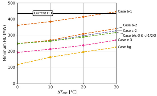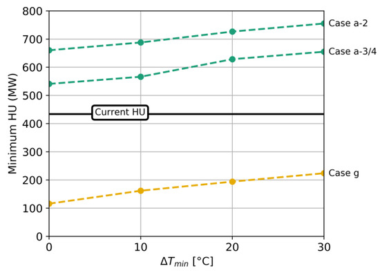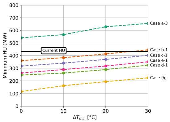 The targets closest to the current hot utility demand are obtained for case b-1 (complete process-to-process integration within units and no steam network) and a ΔTmin of 20 or 30 °C. However, this system aggregation level does not represent the current refinery heat integration very well. In reality, the refinery uses the steam network quite extensively for heat integration between units. On the other hand, the targeted process-to-process heat exchange within units is not fully achieved.